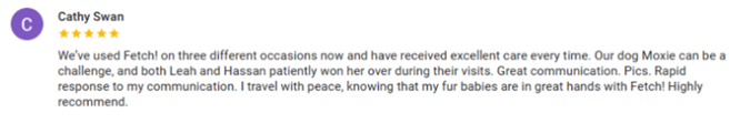 Many pet parents share how much peace of mind Fetch! brings. Cathy Swan, a repeat customer, explains: